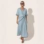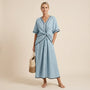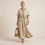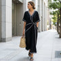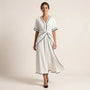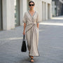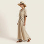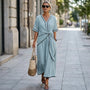 Designed for effortless elegance, this wrap-style maxi dress offers a flattering silhouette with graceful movement. The V-neckline and tie-waist detailing enhance the natural waist while maintaining relaxed comfort. Its lightweight breathable fabric makes it perfect for warm-weather dressing. Ideal for vacations, brunch outings, or casual evening gatherings. Pair it with sandals or heels for easy day-to-night styling. A timeless wardrobe essential.