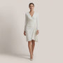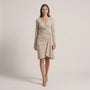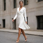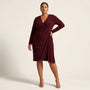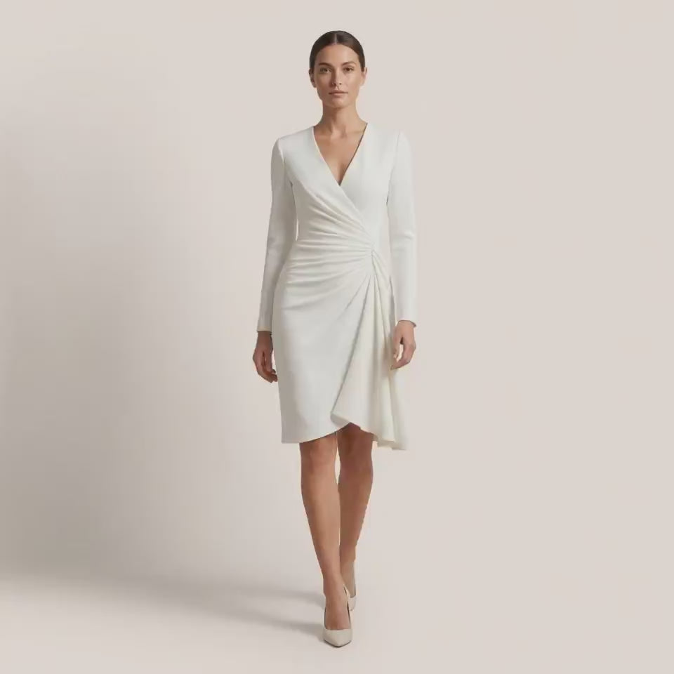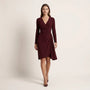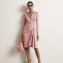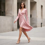 Designed for effortless elegance, this wrap midi dress features a flattering V-neckline and soft waist draping that enhances natural curves. The long sleeves add sophistication, making it ideal for office wear, formal lunches, and evening gatherings. The asymmetric hem adds graceful movement while walking. Crafted for comfort and style, it transitions seamlessly from day to night. Perfect for all seasons with minimal styling needed.