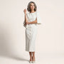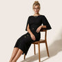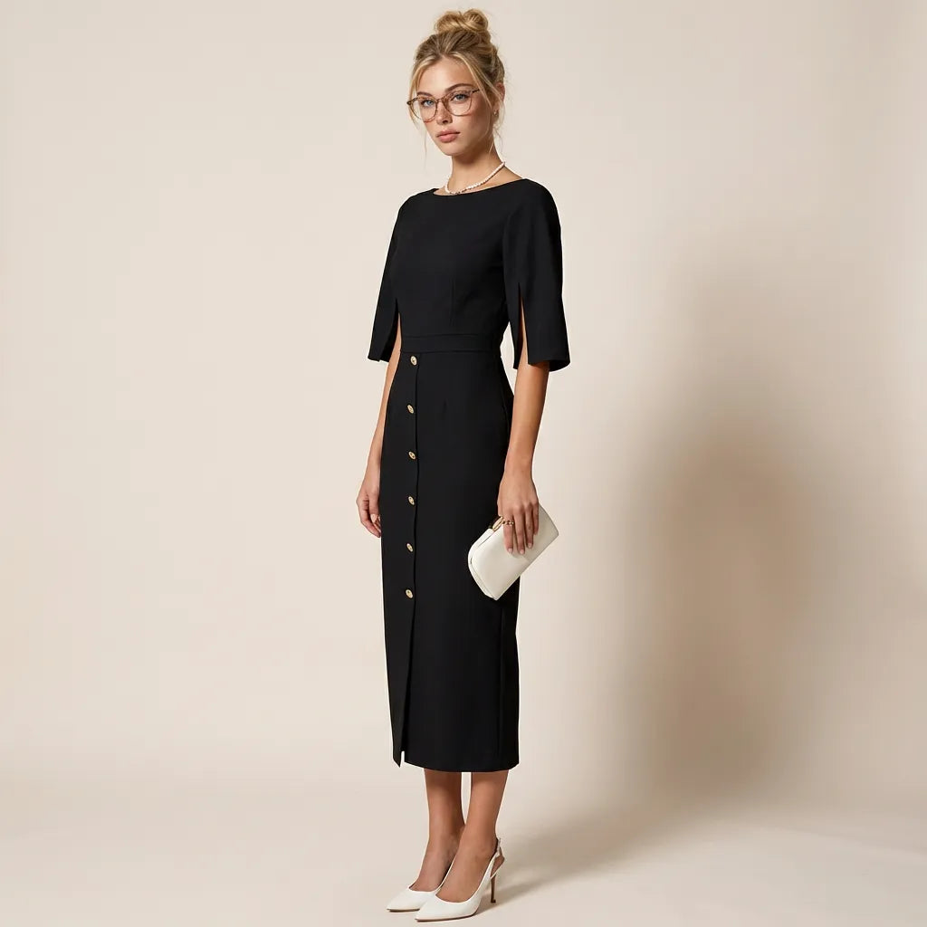A refined statement in modern tailoring, this cape sleeve midi dress exudes effortless sophistication. Designed with a structured sheath silhouette, it defines the waist while maintaining clean architectural lines. The split cape sleeves add graceful movement and understated drama. Decorative front buttons and a subtle front slit enhance its polished appeal. Perfect for formal luncheons, corporate meetings, or elegant evening gatherings.