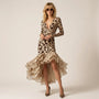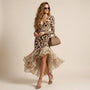 Bold and unapologetically feminine, this leopard high-low dress is designed to command attention. The sculpted stretch bodice contours the figure, while the plunging neckline enhances its sultry appeal. A dramatic cascading chiffon hem adds fluid movement with every step. Perfect for upscale dinners, cocktail parties, or glamorous vacations. A true statement piece for confident styling.