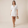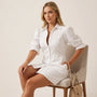 This refined white shirt mini dress blends classic tailoring with modern femininity, featuring a structured button-down front and softly contoured waist that creates a flattering, polished silhouette. The puffed half sleeves with delicate cuff detailing add subtle volume and sophistication, while the crisp collar enhances its timeless appeal. Crafted for versatility, the dress transitions effortlessly from daytime outings to evening gatherings, pairing seamlessly with heels or flats. Clean lines, comfortable structure, and effortless elegance make it a must-have staple for a chic, minimal wardrobe.